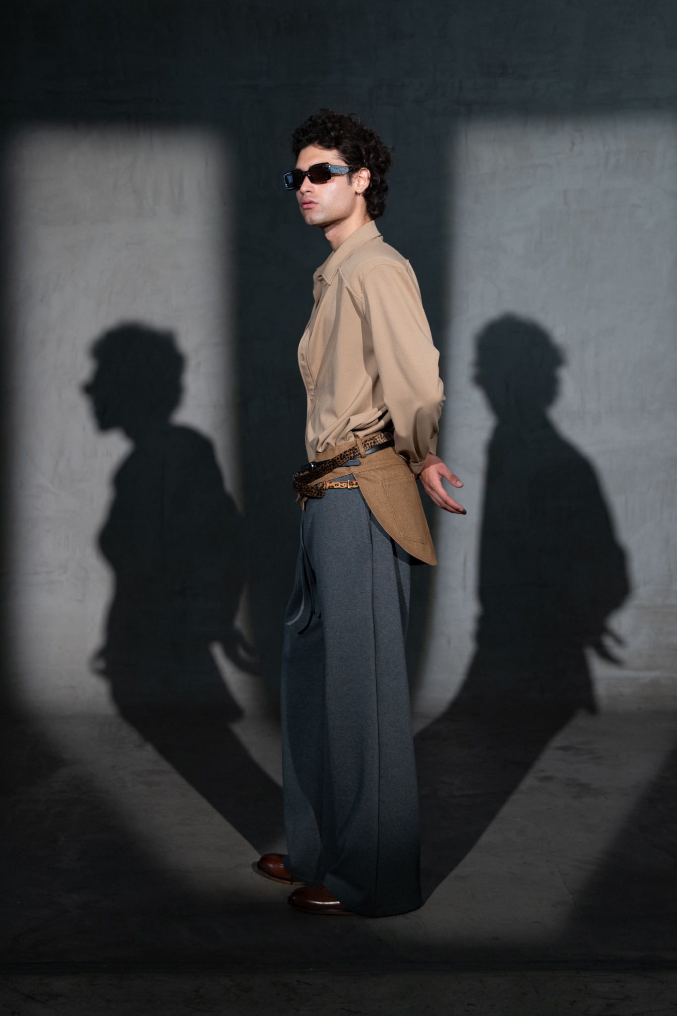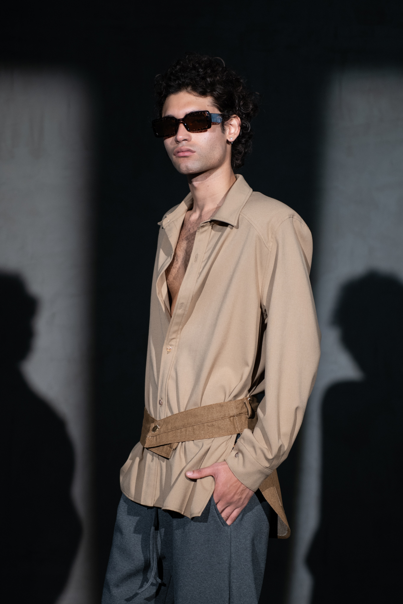 Camisa de algodón manga larga estructurada con hombreras removibles. Combinada con espalda tipo pantalón con pretina ajustable de mezclilla