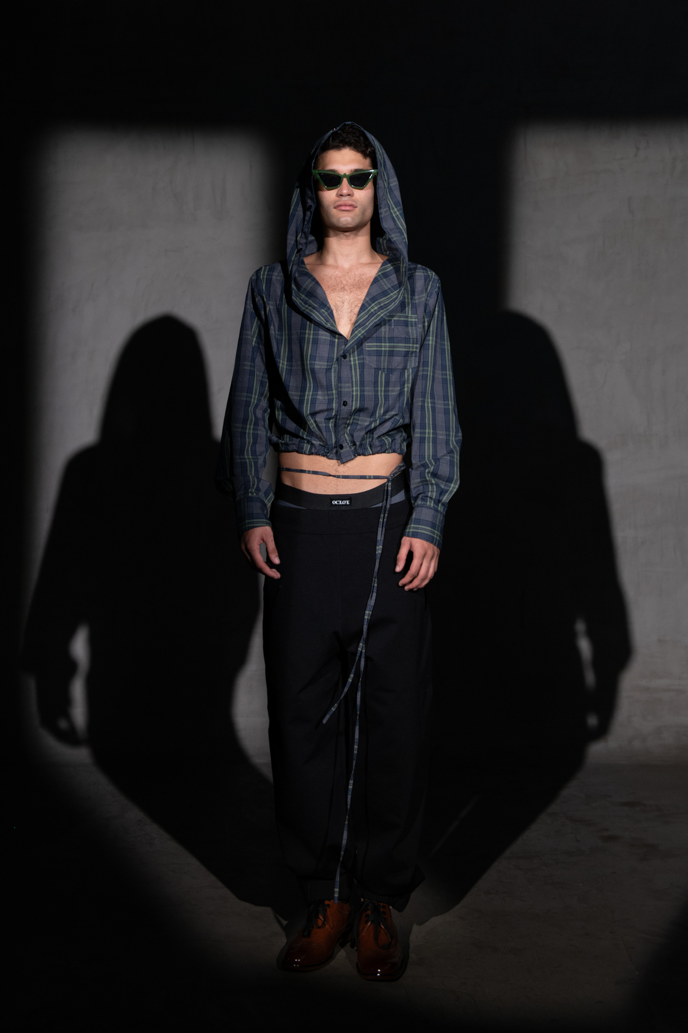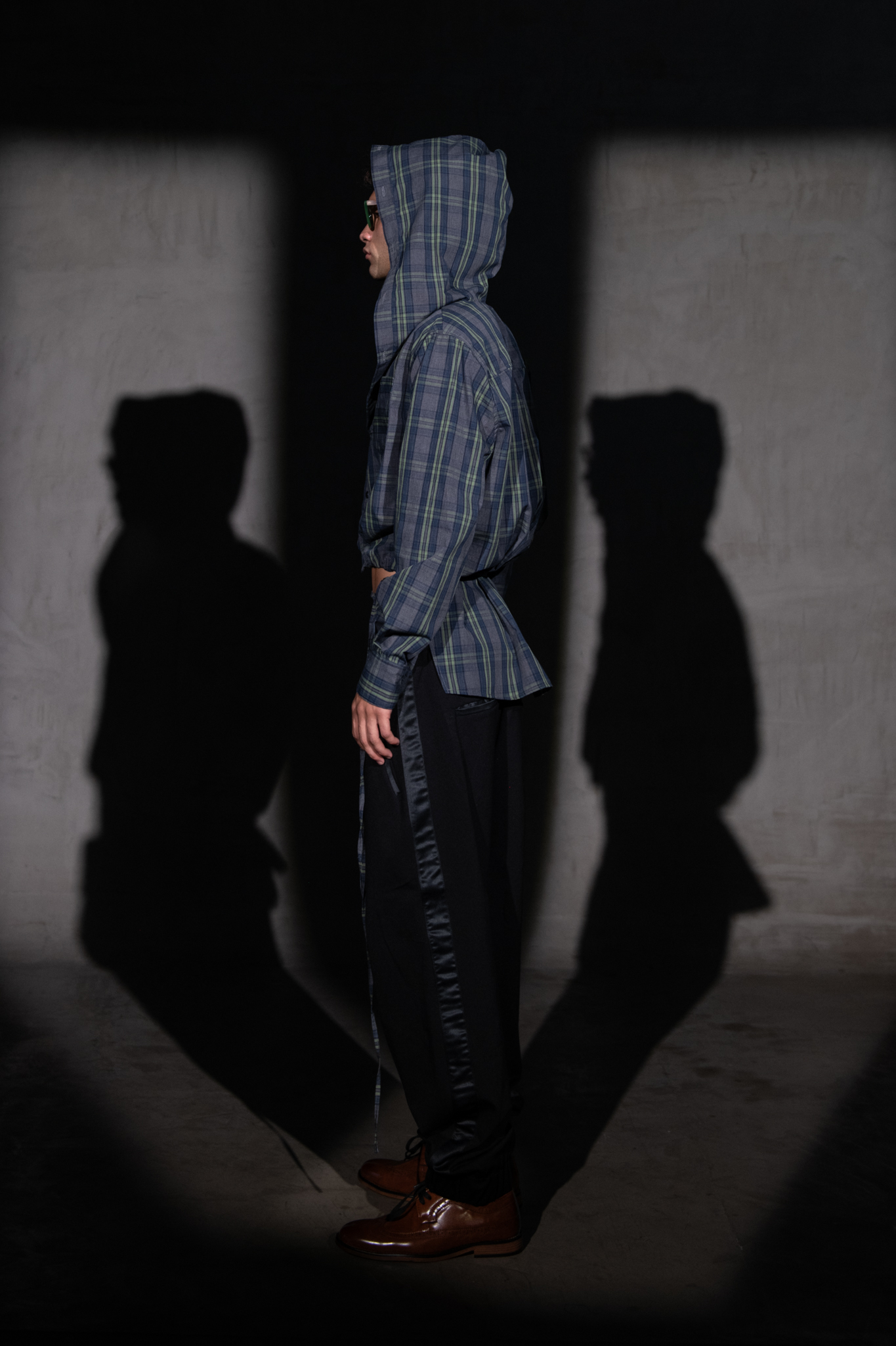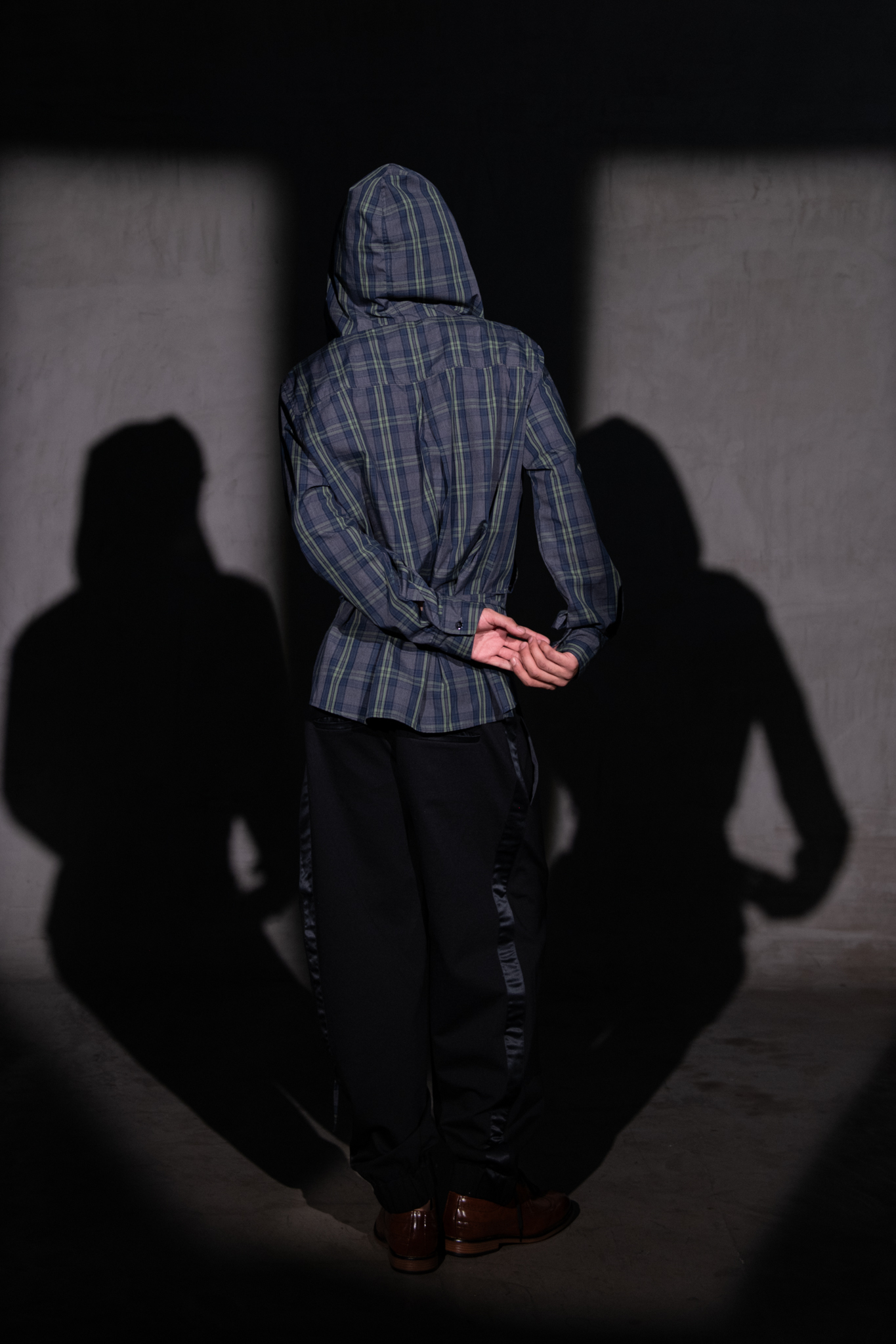 Cropped shirt with hoodie and long sleeves with buttoned cuffs. Front button closure.