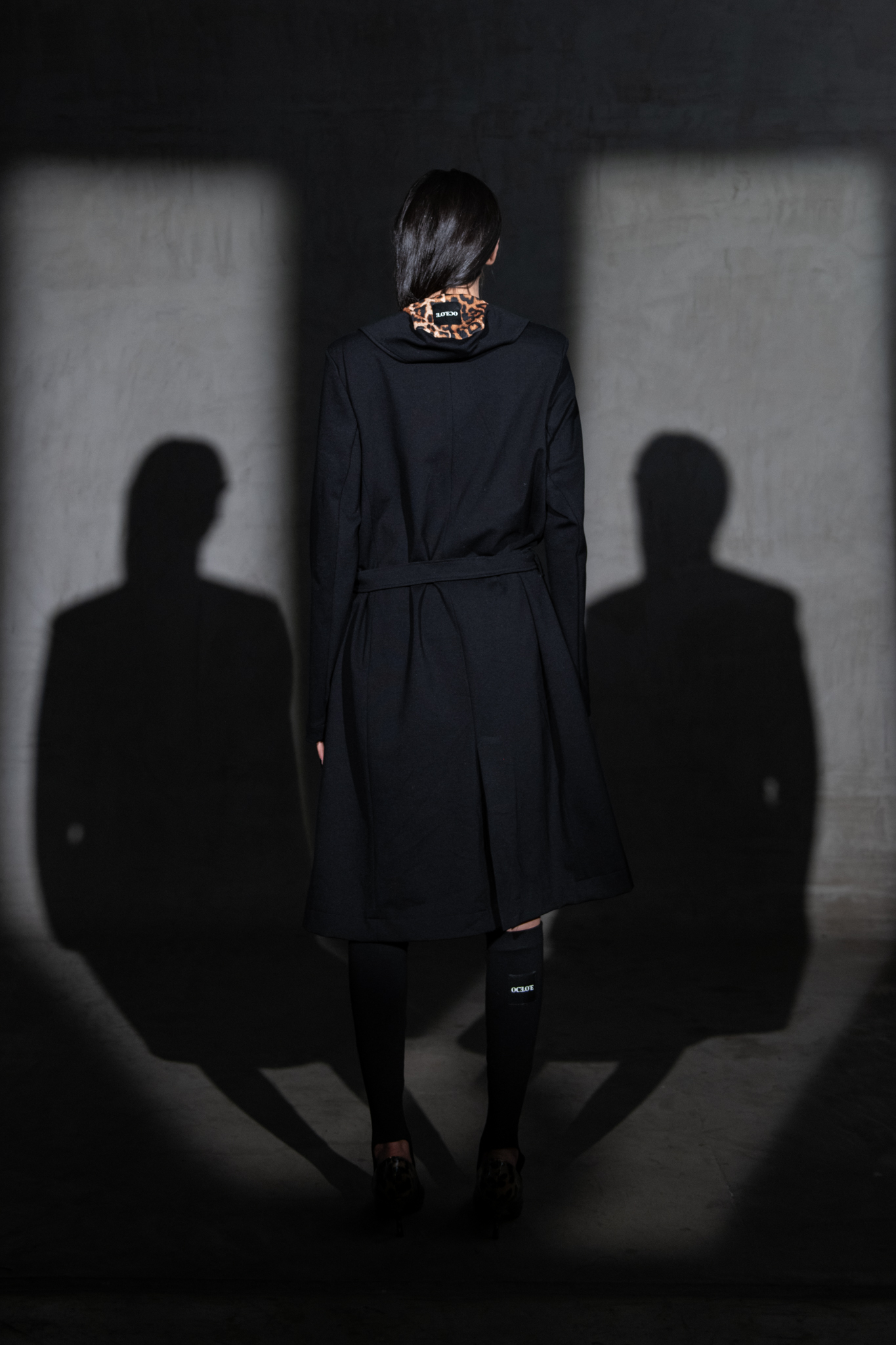 Saco largo con detalle en espalda de cuello caído y etiqueta expuesta, con hombreras y jareta. Bolsas frontales e interior en OC animal print.